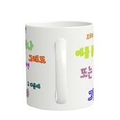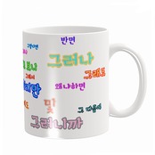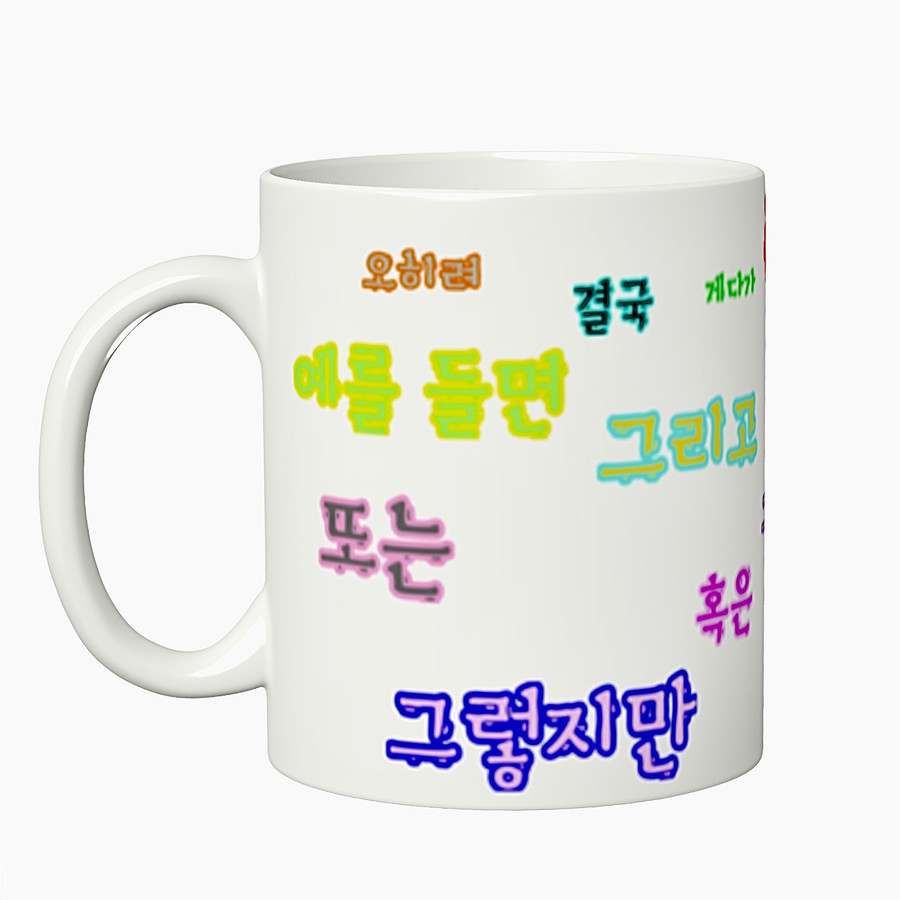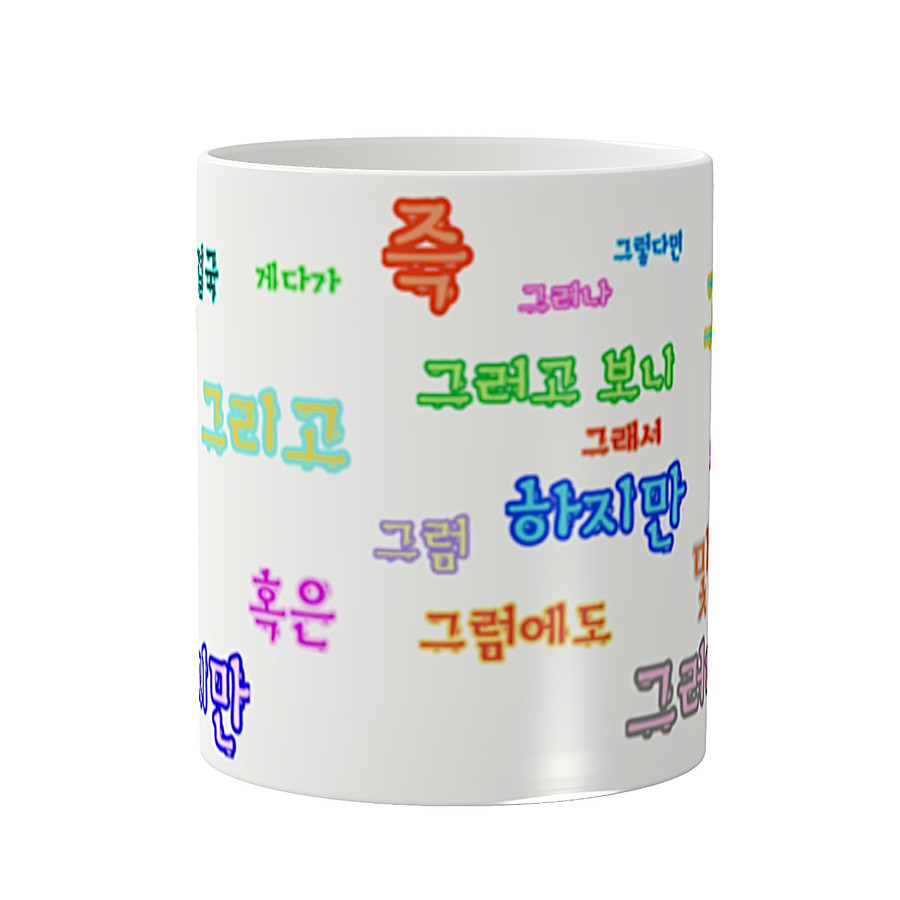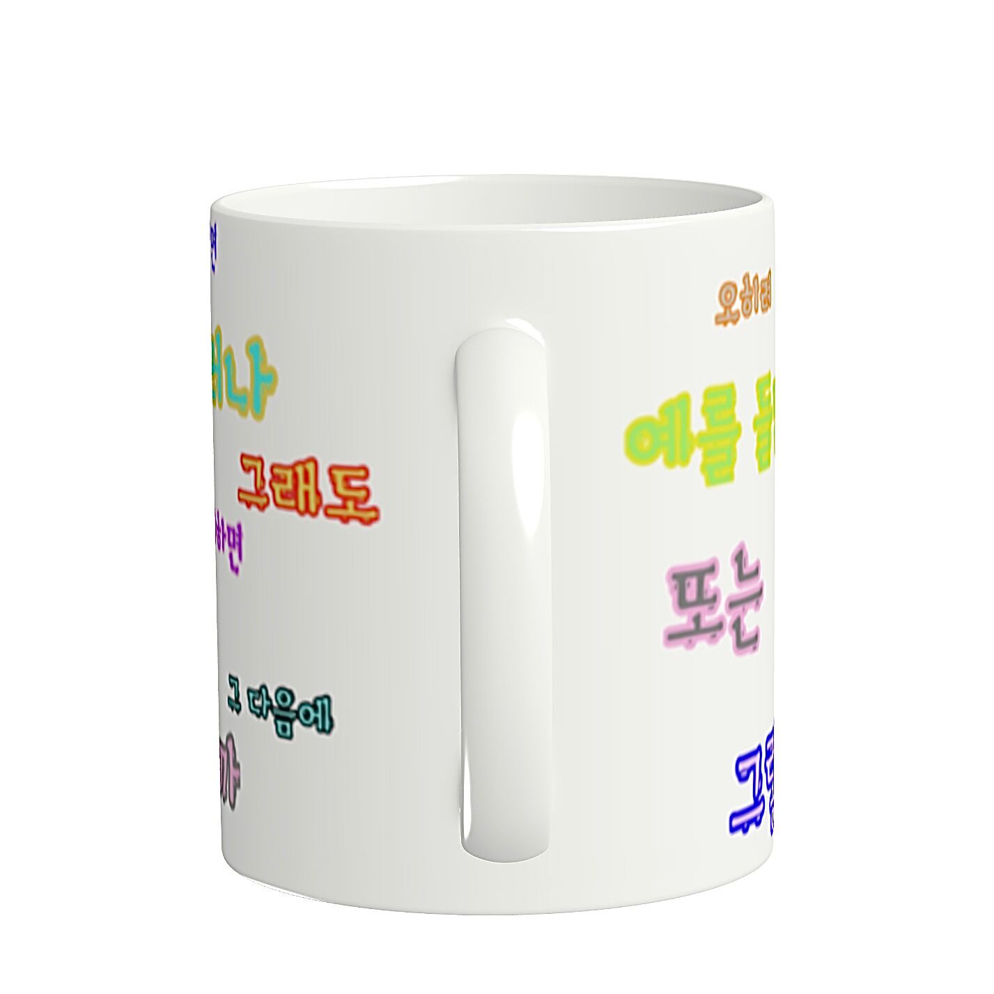 カラフルなハングルで書かれた、接続詞たちのマグカップ。